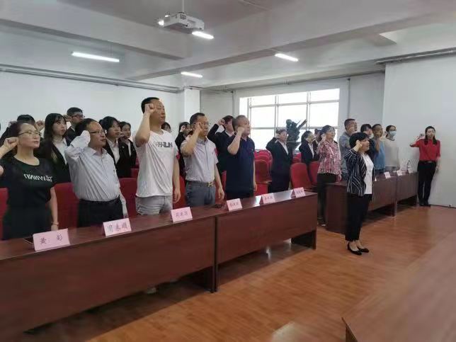 领导教师为新党员佩戴党员徽章,在领誓人孙美晖书记的带领下,在场全体党员高举右拳,面向党旗,庄严宣誓,坚定的目光表达愿为共产主义奋斗终身的决心。