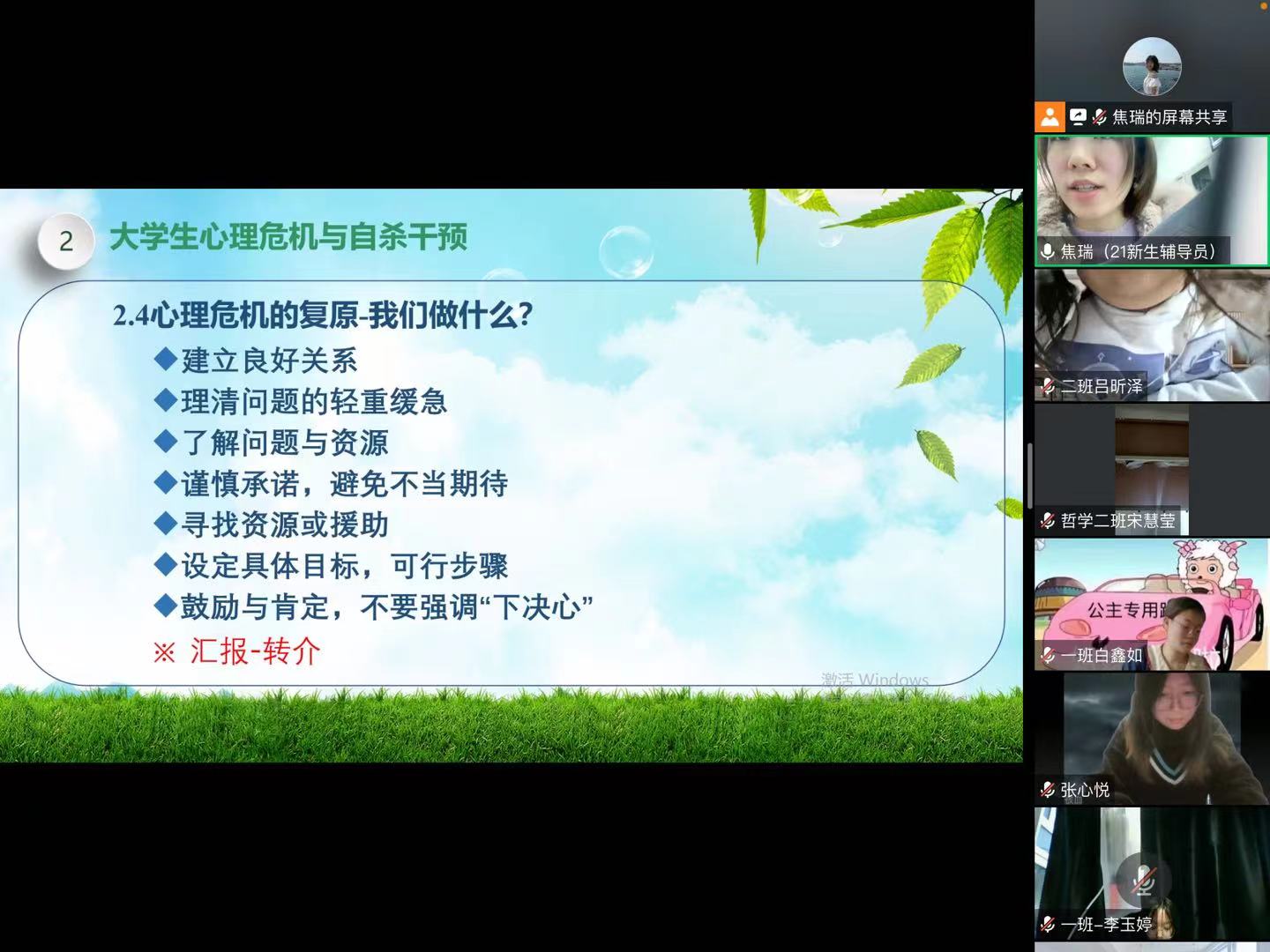 第三,焦老师普及了与大学生心理危机与自杀干预的相关知识。在这个环节,同学们认识到了心理危机的影响及复原方法,了解了自杀的预防与干预,对于自杀的常见误解,提高了对自杀进行干预与预防的能力。焦老师强调,请大家记住“这总会过去”,一切事情都会过去,不要采取冲动鲁莽的行为,这对自己及家人都是巨大的伤害。