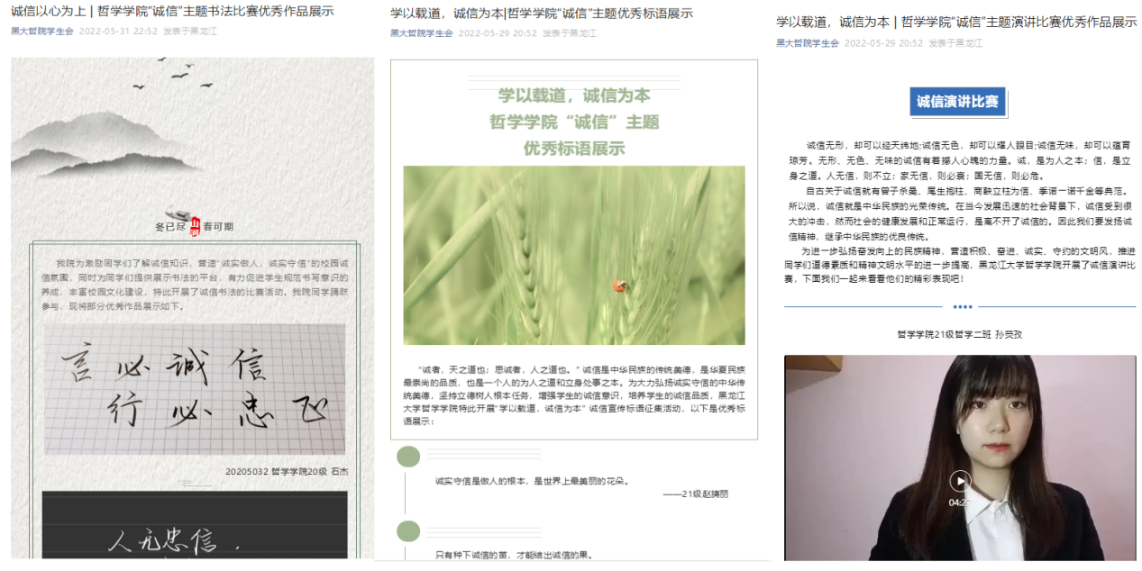 发布了优秀作品展示专题推送,展现了同学们对诚信精神的思考和理解。