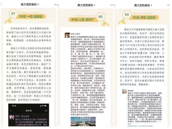 结合疫情防控形势,本次活动采取线上形式,同学们在微信朋友圈转发学校官方视频,对黑龙江大学发挥多学科结合、相互渗透的办学优势,黑龙江大学校素质水平和院系专业实力以及黑龙江大学重点学科建设、特色办学理念和发展模式进行了宣传。本次活动的开展有效激发了广大学生热爱母校之情怀,使同学们立志勤奋读书,争取未来能够为母校的建设与发展添砖加瓦。