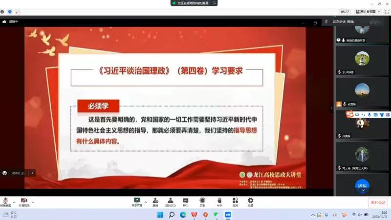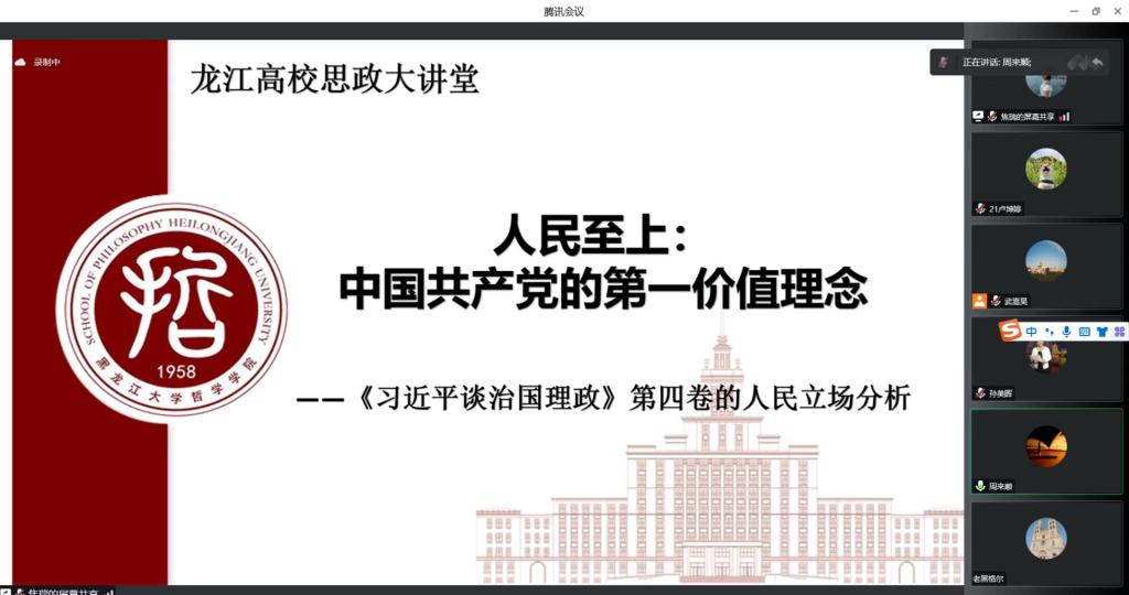 会上全体教工共同收看了点“绿”成金—践行习近平生态文明思想的龙江答卷以及人民至上:中国共产党的第一价值理念—《习近平谈治国理政》第四卷的人民立场分析两场精彩的课程。大家在陈江波教授的讲述下无不被以老一代林业工人马永顺和新时代森林瞭望员朱彩芹为代表的龙江人民守护绿水青山的真实故事所深深感动,结合邹佰峰教授关于《习近平谈治国理政》第四卷中人民立场的分析,更是深切感受到要始终以高度的政治自觉和使命担当,坚持党的群众路线,努力提高自身业务能力,更好地为群众服务,以实际行动践行人民立场。