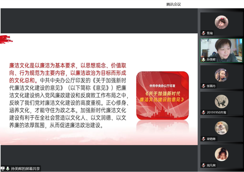 孙美晖书记主讲了主题为“新时代大学生廉洁文化自我修养”的党课,孙书记从文件入手讲解了廉洁教育的重要意义,向各位学生党员介绍了中共中央《关于加强新时代廉洁文化建设的意见》的内容与精神,指出廉洁文化是以廉洁为基本要求,以思想观念、价值取向、行为规范为主要内容,以廉洁政治为目标形成的文化总和,并强调正心修身、涵养文化,才能守住为政之本。