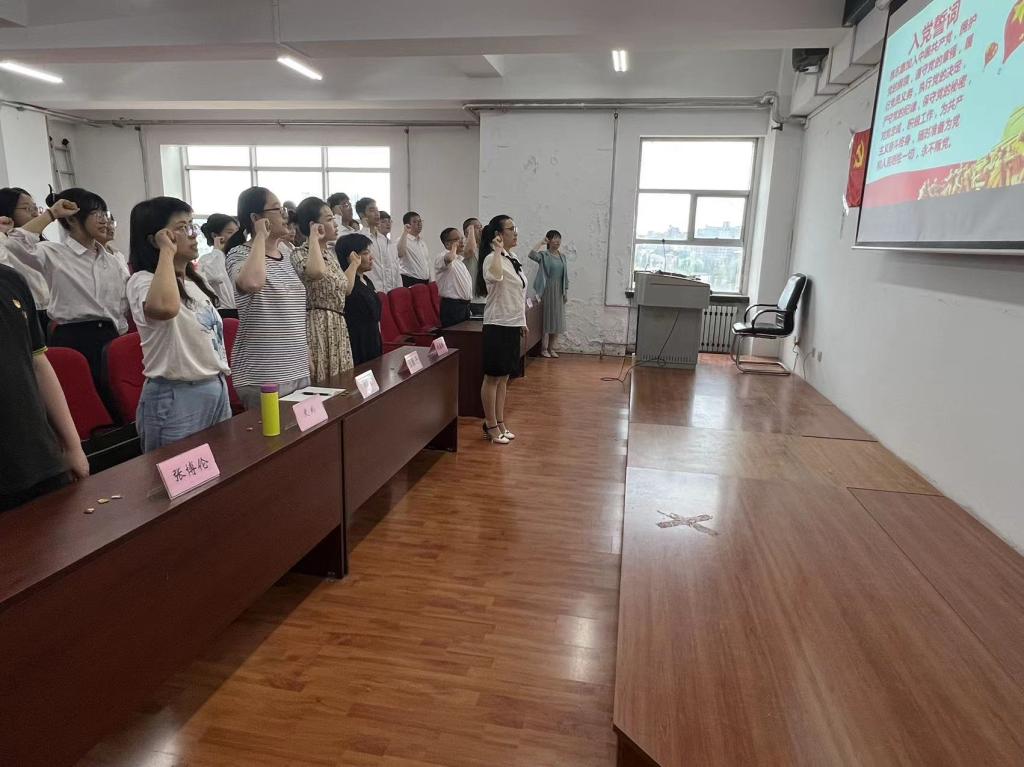 仪式第二项是全体新发展党员宣读入党誓词,全体老党员重温入党誓词。在领誓人魏义霞老师的带领下,全体师生党员面向党旗,举起右手,握拳过肩,庄严宣誓。在铮铮誓言中,用党的光荣传统和优良作风坚定信念、凝聚力量,用党的实践创造和历史经验启迪智慧、砥砺品格。