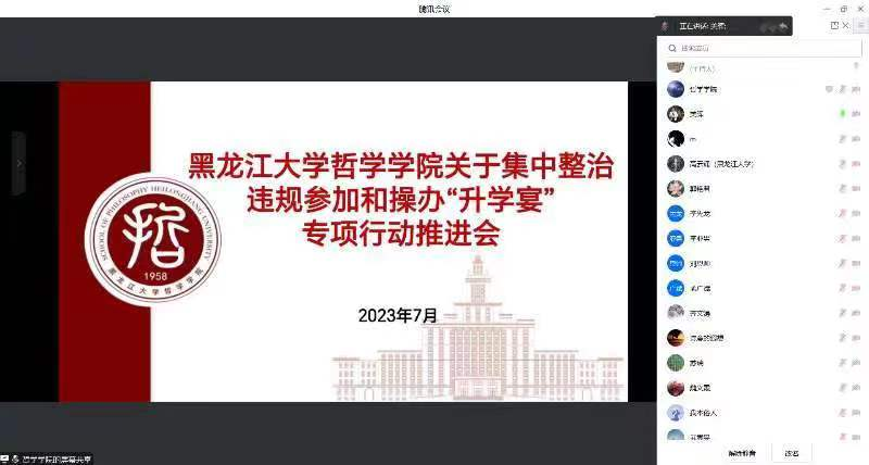 于线上召开集中整治违规参加和操办“升学宴”工作推进会,会议由哲学学院党总支书记孙美晖主持并传达文件精神,哲学学院全体教师参加会议。