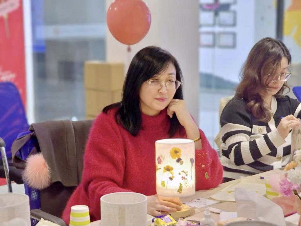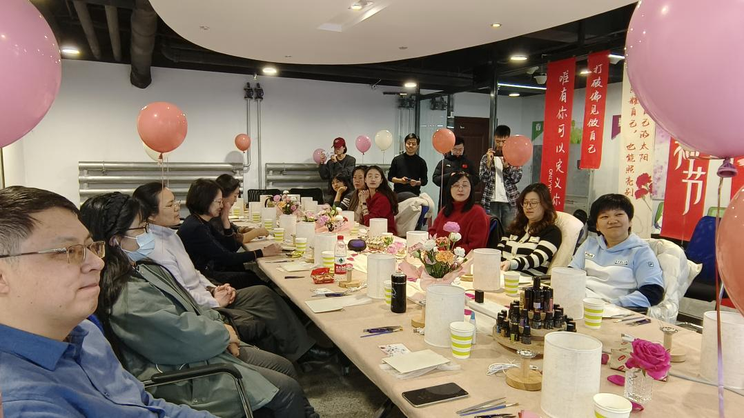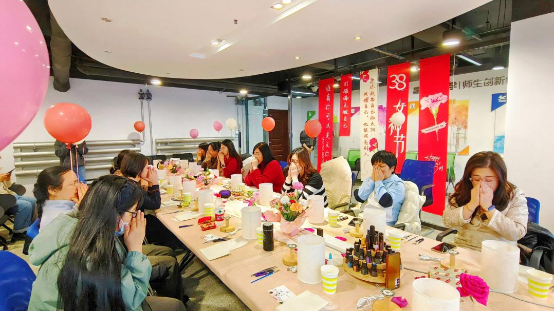 “点亮生活 芬芳你我”联欢活动,旨在通过压花台灯的方式,将妇女节注入更多艺术与美好,以此来表达对女性的敬意与关爱。专业讲师以天然精油为依托,为老师们带来了沉浸式的体验,大家聆听着大自然的声音、沉浸其中、调整情绪、进一步加深放松状态。
