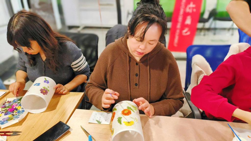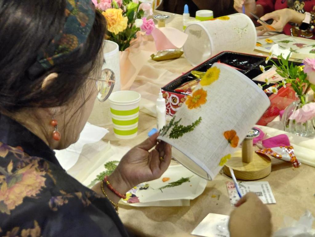 老师们在专业讲师的指导下,利用事先准备的天然风干花卉,充分发挥想象,在灯罩上进行花灯创作。在创作过程中,巧妙地组合花材、细致地粘贴、精心地封膜、装灯,柔和的光线带给大家满满的温馨感与幸福感。各位老师相互探讨,分享自己的手工作品,氛围融洽,满室生春。