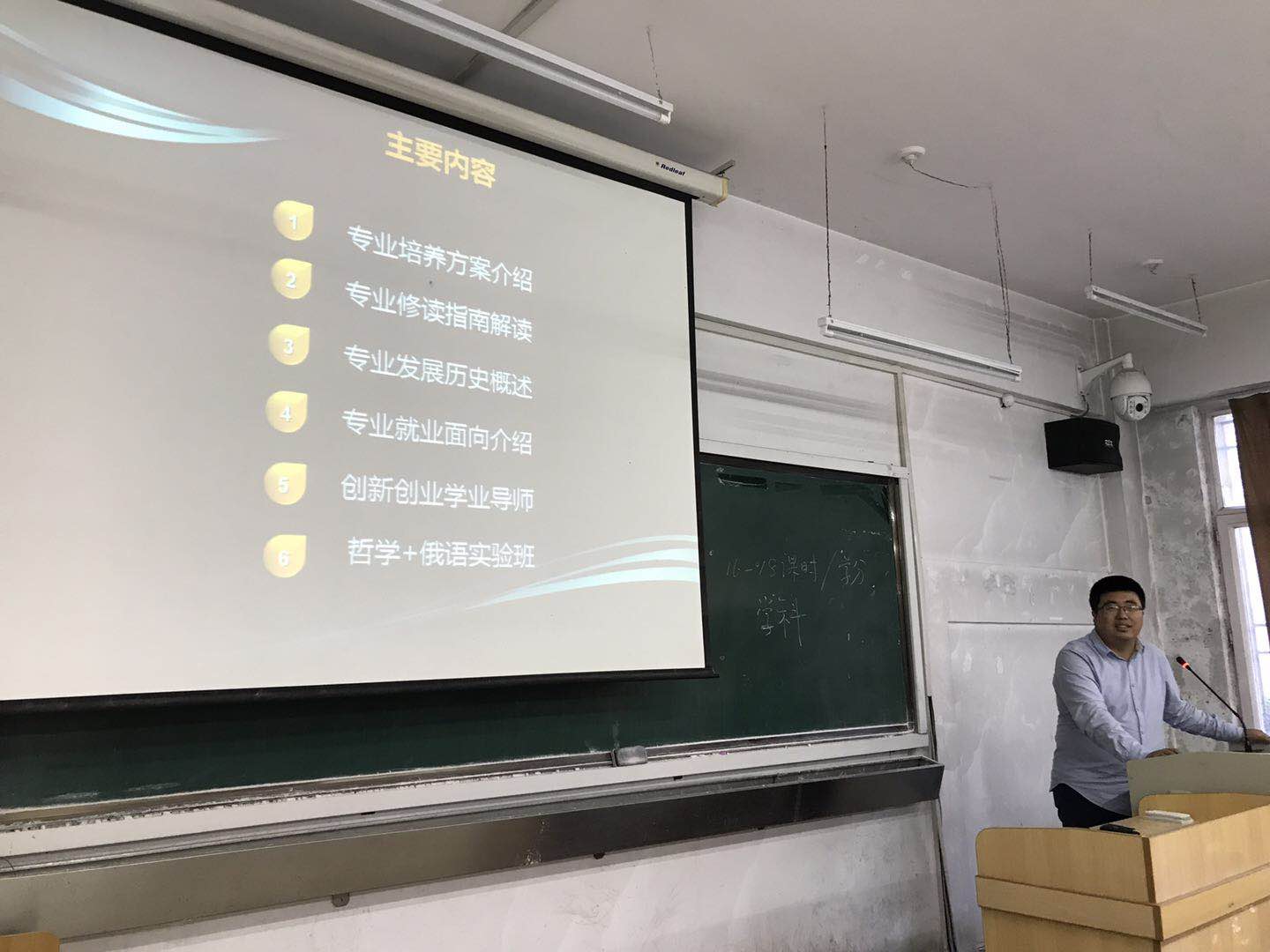 王秋老师分别从专业培养方案介绍、专业修读指南解读、专业发展历史概述、专业就业面向介绍、创新创业学业导师、哲学+俄语实验班等六个方面进行了详细讲解。