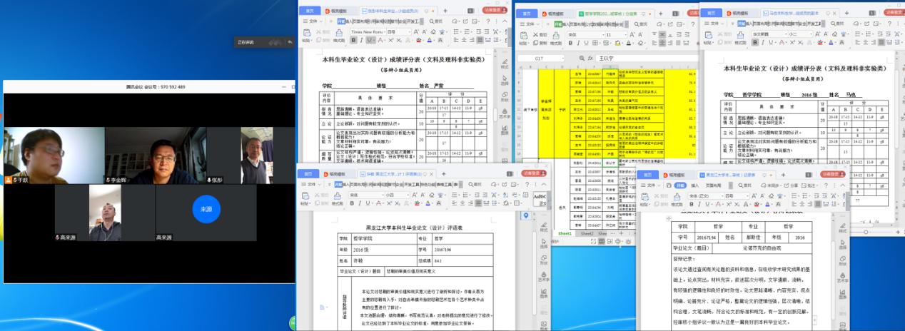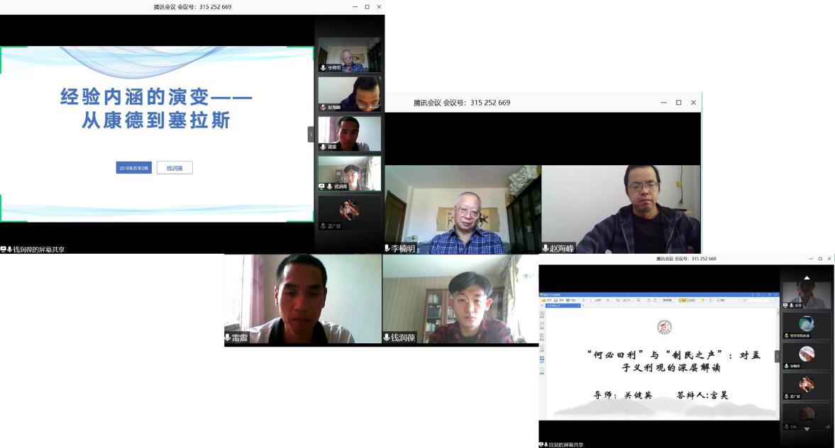 本次答辩分为七组,采取线上答辩、线下审核两种形式进行。其中第一组为线上答辩组,应用腾讯会议软件进行视频连接,钱润葆、宫昊、隽文婷三位同学分别介绍了以“塞拉斯经验哲学”、“孟子义利观”、“先秦哲学中的天人观”等为主题的毕业论文。李楠明教授、赵海峰教授和雷震教授作为答辩委员,对三位同学的论文进行了点评和评分。第二组至第七组为审核组,各组老师通过微信、邮件、视频等方式进行沟通,对同学们的毕业论文进行评审。