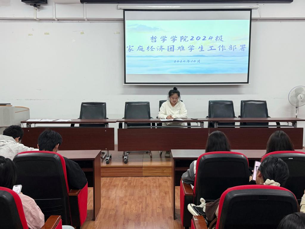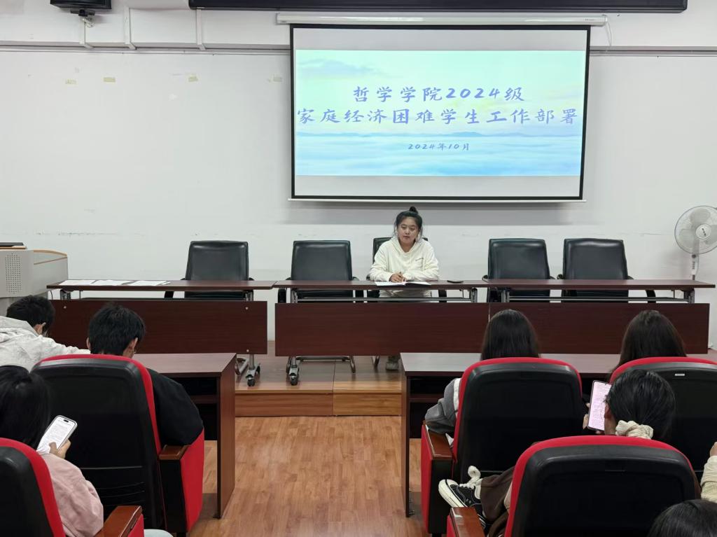 于10月12日在汇文楼937召开家庭经济困难学生认定工作部署会暨政策解读会,会议由2024级辅导员赵慧雪老师主持,2024级本科学生参加。