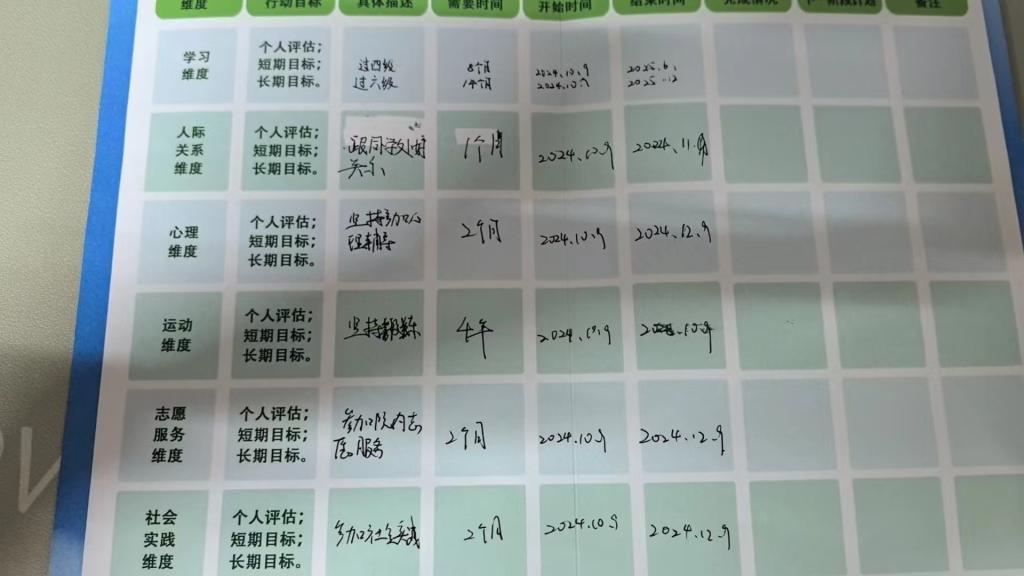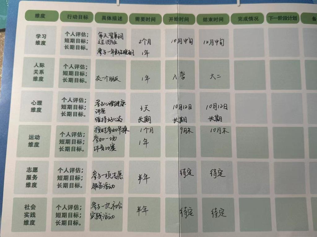 晚自习前,辅导员赵慧雪老师围绕新生入学职业生涯规划中“六个维度”为核心,带领同学们画出目前属于自己的“六边形”,这一视觉化的自我审视过程,不仅让同学们对自己的现状有了更为直观的认识,也激发了他们对于未来成长的渴望。同学们也对照自己目前的“六边形”,结合本学期的目标与愿景,制定出详尽的成长规划。