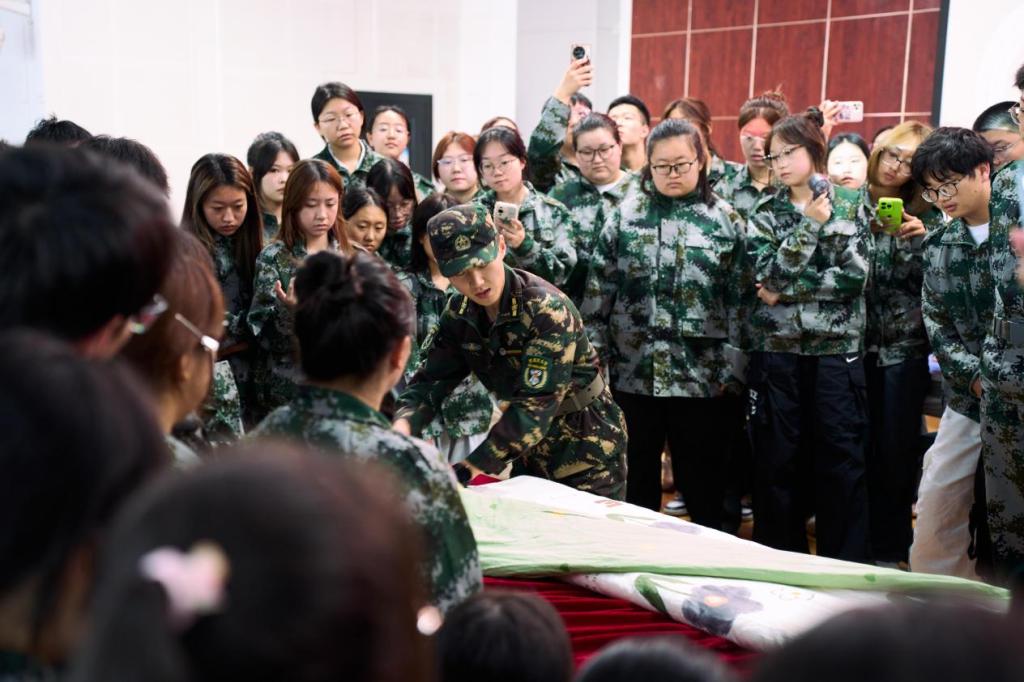 最后,教官还现场进行了叠被子示范教学。这一直观生动的示范,不仅让同学们领略了军人严谨细致的作风,也更深刻地理解了军训对于培养良好习惯和过硬作风的重要意义。