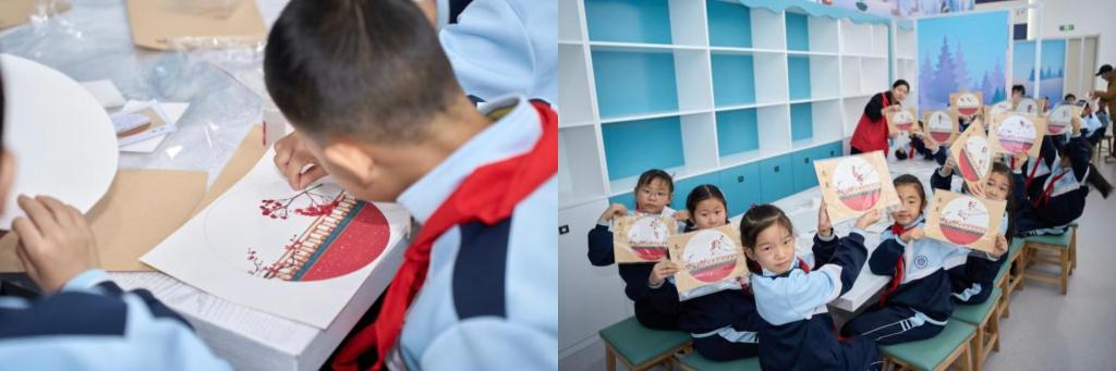 在随后的“冬至”主题手工环节,大学生们和小学生搭档围坐在一起。在大学生志愿者一步步的指导下,小学生们将这些自然材料拼贴成富有冬日意趣的树叶画作。一件件作品在结对协作中完成,现场气氛活跃。“脚滑子”非遗工坊的刘锴老师也为孩子们带来了一场冰雪技艺体验。