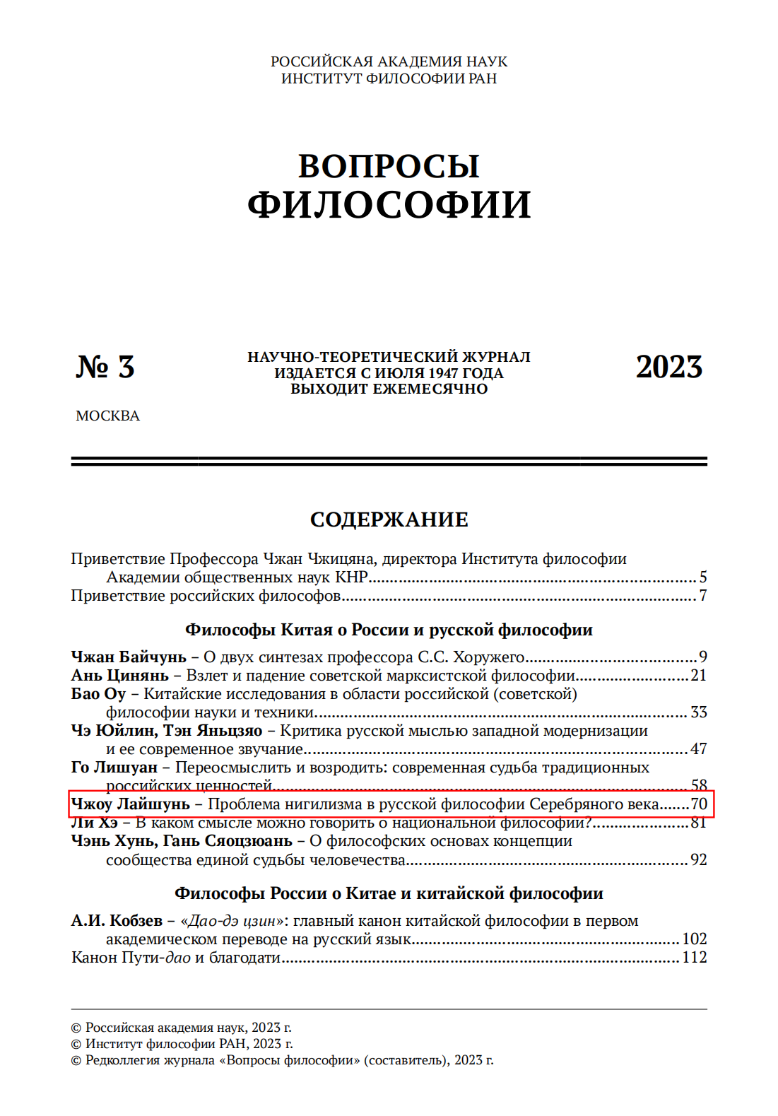 《ВОПРОСЫ ФИЛОСОФИИ》(《哲学问题》)——周来顺《Проблема нигилизма в русской философии Серебряного века》