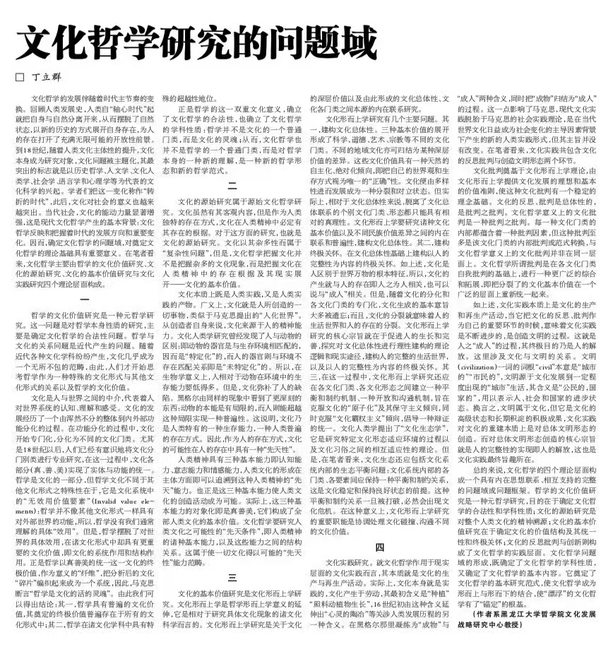 丁立群教授在《光明日报》(2025年3月17日15版)发表了题为《文化哲学研究的问题域》的学术文章,深入探讨了文化哲学的理论框架及其时代意义。该文章不仅探讨了文化哲学边界问题,而且就新时期如何深入文化哲学研究提供了新思路。