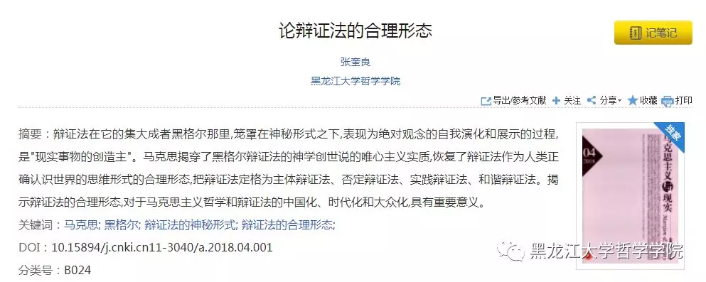 张奎良教授的《论辩证法的合理形态》一文被《新华文摘》2018年第19期全文转载,并被封面推荐,该文原载于《马克思主义与现实》2018年第4期。