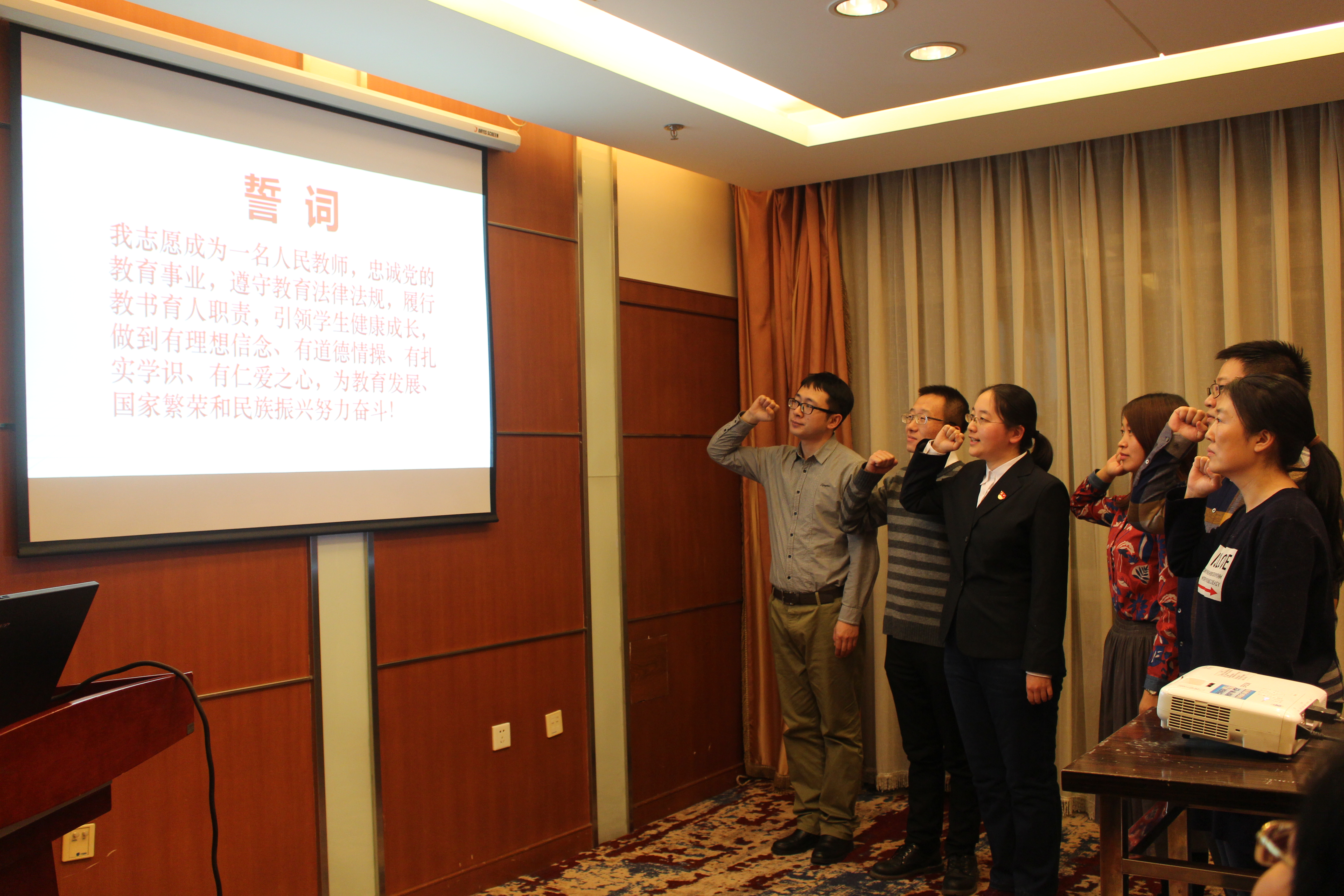 仪式上,林菲、周红宇、陈莹、于跃、苏瑞、岳凤等6位新入职教师举起右拳进行了庄严宣誓,立志忠诚党的教育事业,遵守教育法律法规,履行教书育人职责,引领学生健康成长,做一名有理想信念、有道德情操、有扎实学识、有仁爱之心,为教育发展、国家繁荣和民族振兴努力奋斗人民教师。