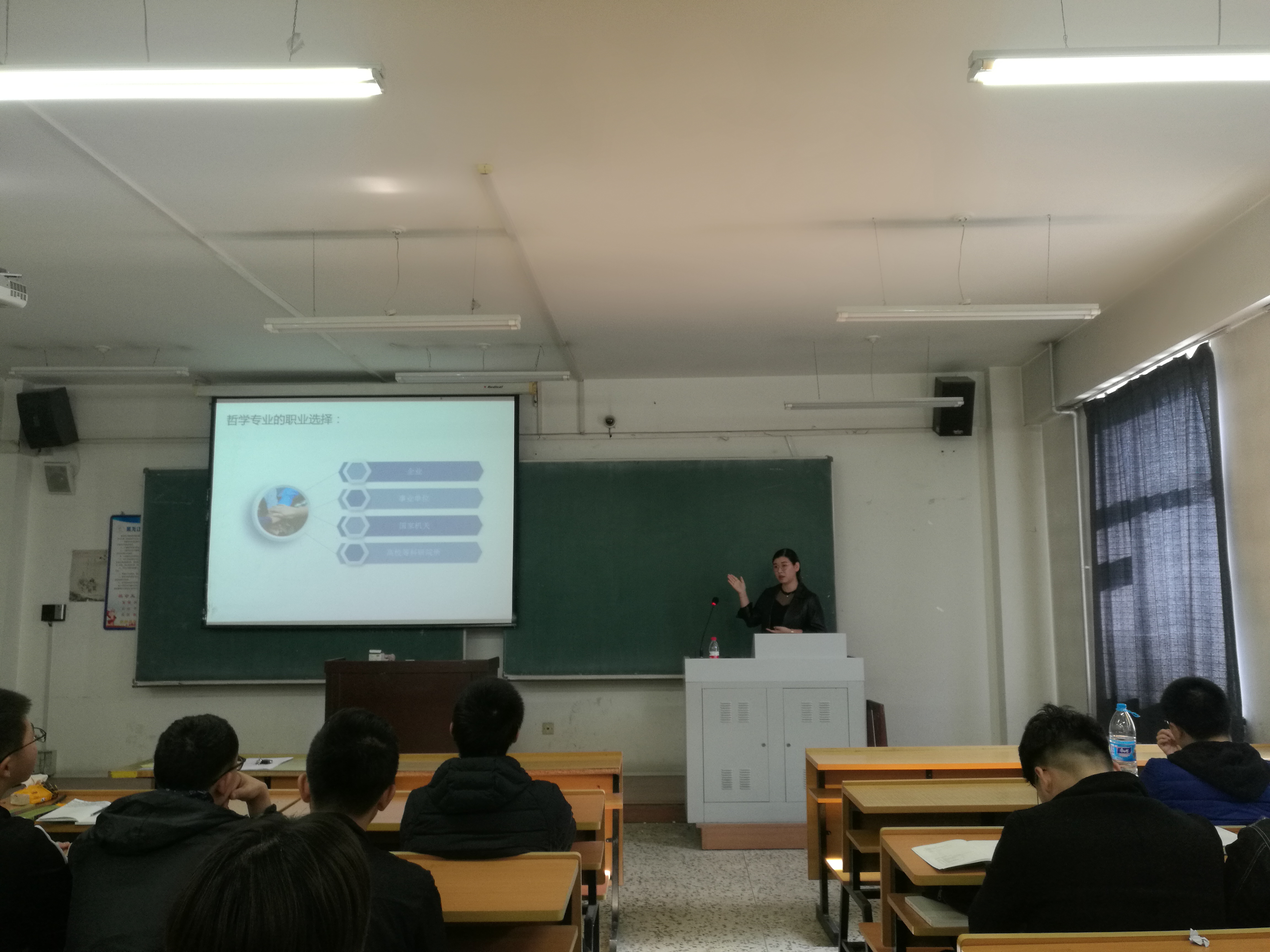 接下来,徐学野学姐对哲学的专业特点、就业前景、职业规划等方面进行了详尽的阐述和介绍。通过介绍学习工作经历,让同学们认识到大学阶段无论是否对本专业感兴趣,都要保持一个求知的心态,保持学习的热情,不断去探索发现自己的兴趣点,发掘自己的潜力,提升自身综合能力与素质。讲座最后,她和同学们互动交流,鼓励大家以积极的心态面对大学生活,多多走出校园,参与社会实践,在实践中去探索、明确职业目标,进行职业生涯规划。