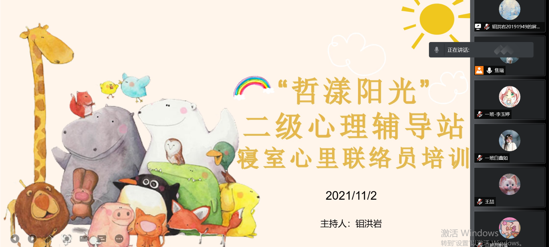 学生的健康成长,“哲漾阳光”二级心理辅导站于11月2日下午一点召开了朋辈团体心理辅导、寝室心里联络员培训会。二级心理辅导站副站长钼洪岩,21级辅导员焦瑞,21级朋辈心理辅导员以及寝室心理联络员参加本次会议。