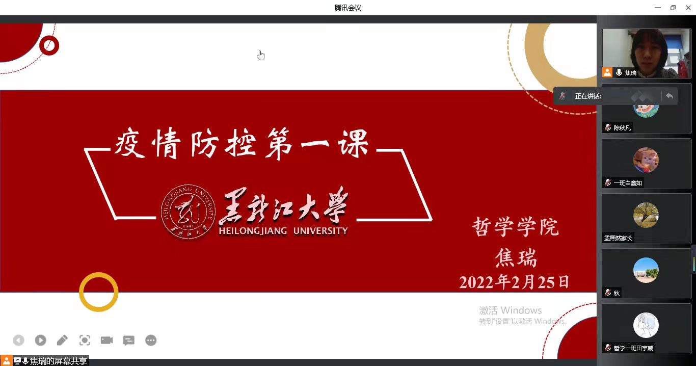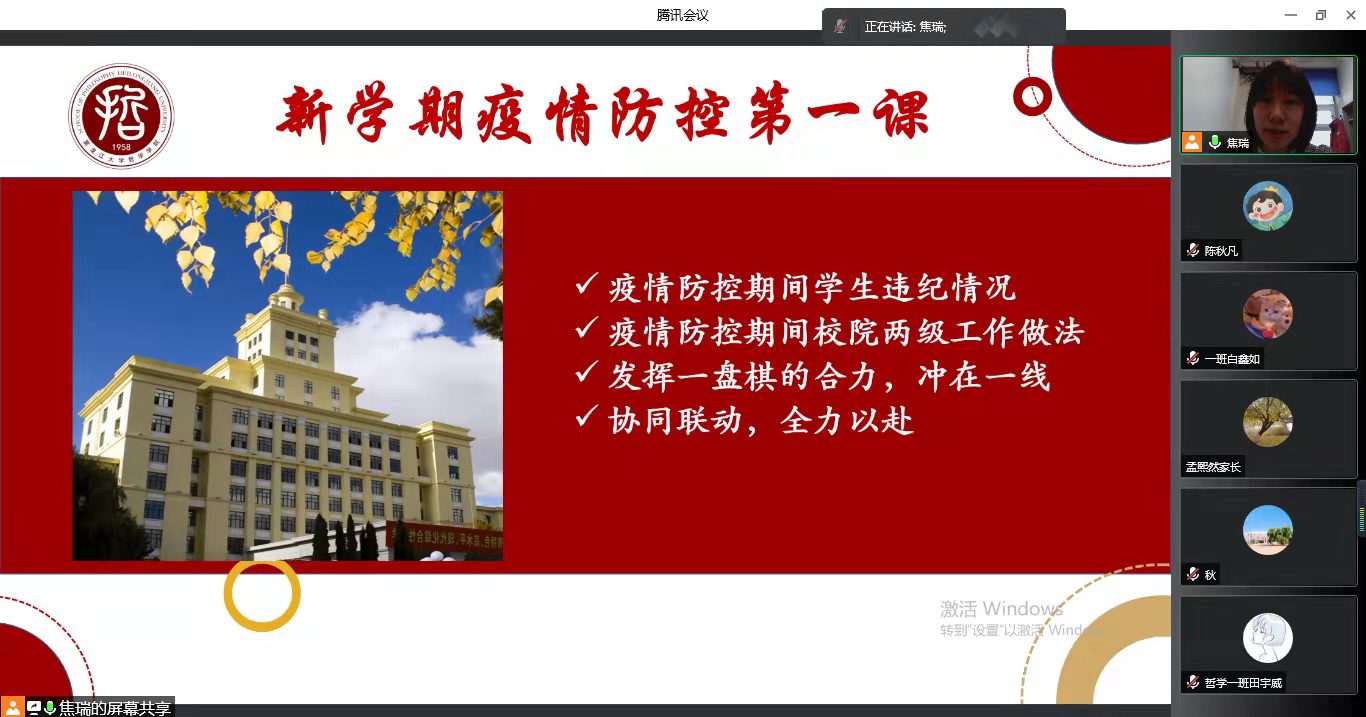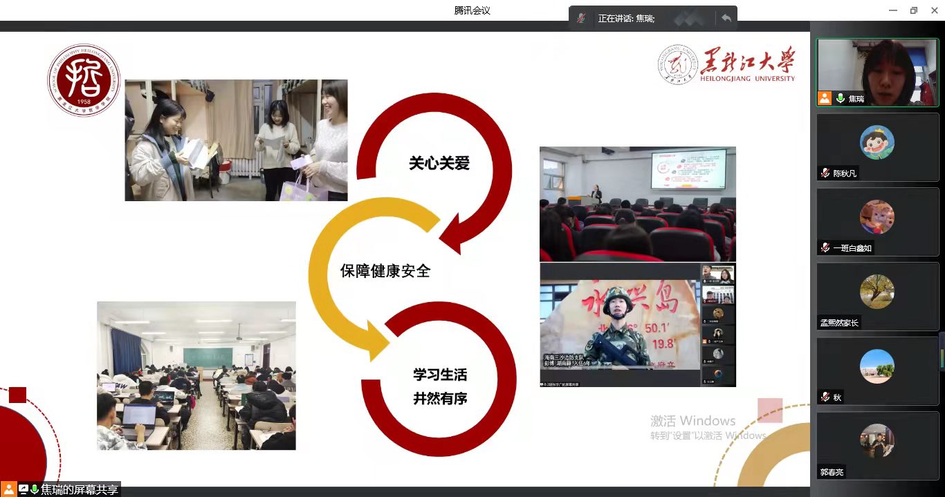 会议伊始,老师讲解了开展疫情防控第一课的目的,老师列出最新的中高风险地区,与家长们共同梳理哈尔滨排查管控政策,指出目前疫情防控形势严峻,我国新增中高风险地区数量不断增长,在新学期开始之际,同学们来自四面八方,因此,当前阶段,疫情防控尤为重要。随后,老师带着大家回顾了21年春季疫情防控的有关工作,从2021年秋季开学报到,再到9月疫情应急管理阶段,黑龙江大学始终贯彻严格管理、发挥一盘棋的合力,老师和志愿者们都冲在疫情防控第一线,学校始终贯彻协同联动,全力以赴,疫情期间,学院也以关心关爱学生为主,着力保障学生健康安全,着力保障学生学习生活井然有序。
