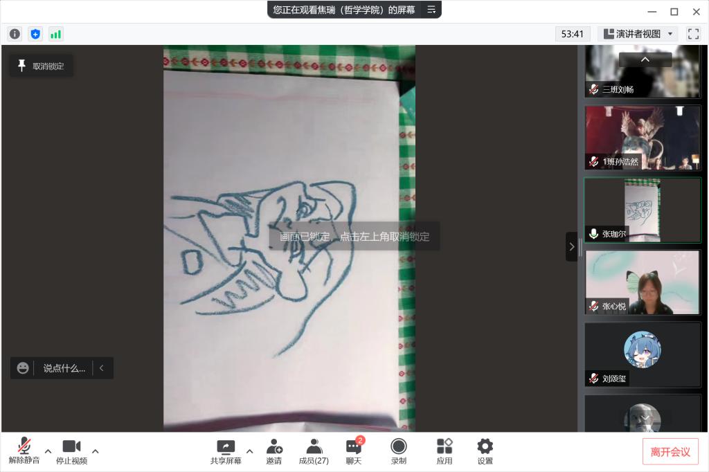 画说疫情,画说未来。焦老师带领大家以绘画的方式描述了开学及现在的心情及感想,引导同学们把心中的想法、困惑、烦恼倾吐出来,并勉励大家在疫情下认真学习,健康生活,帮助了同学们回忆过去畅想未来,进一步增强了同学们的心理素质和综合能力。