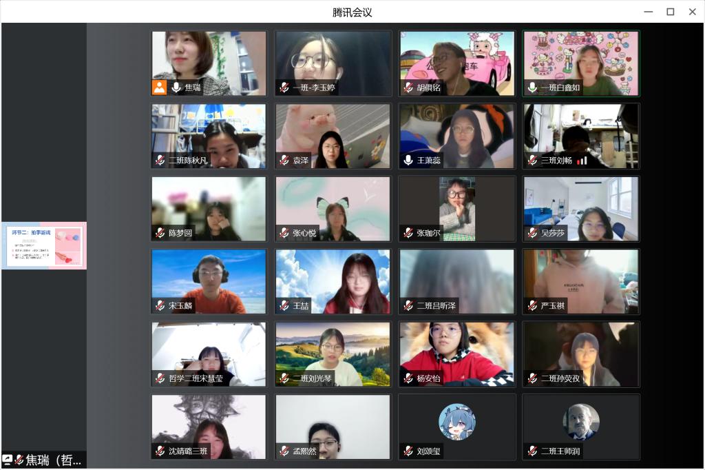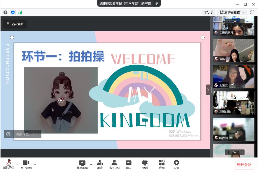 随后,老师上升游戏难度,活动进入到第二个环节“拍手游戏”。焦瑞老师为大家讲解游戏规则,帮助同学们在交往中通过观察、学习、体验、协作的方式认识自我,探讨自我,接纳自我,调整和改善与他人的关系,以形成良好的心理环境。通过简单的互动游戏,同学们在线上彼此互动,心情轻松畅快。