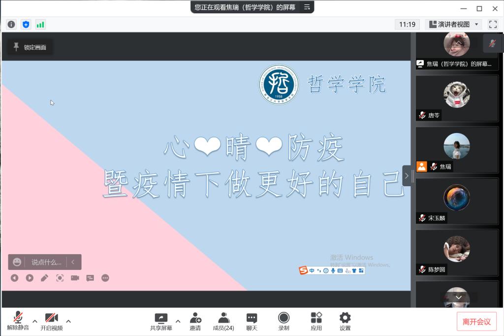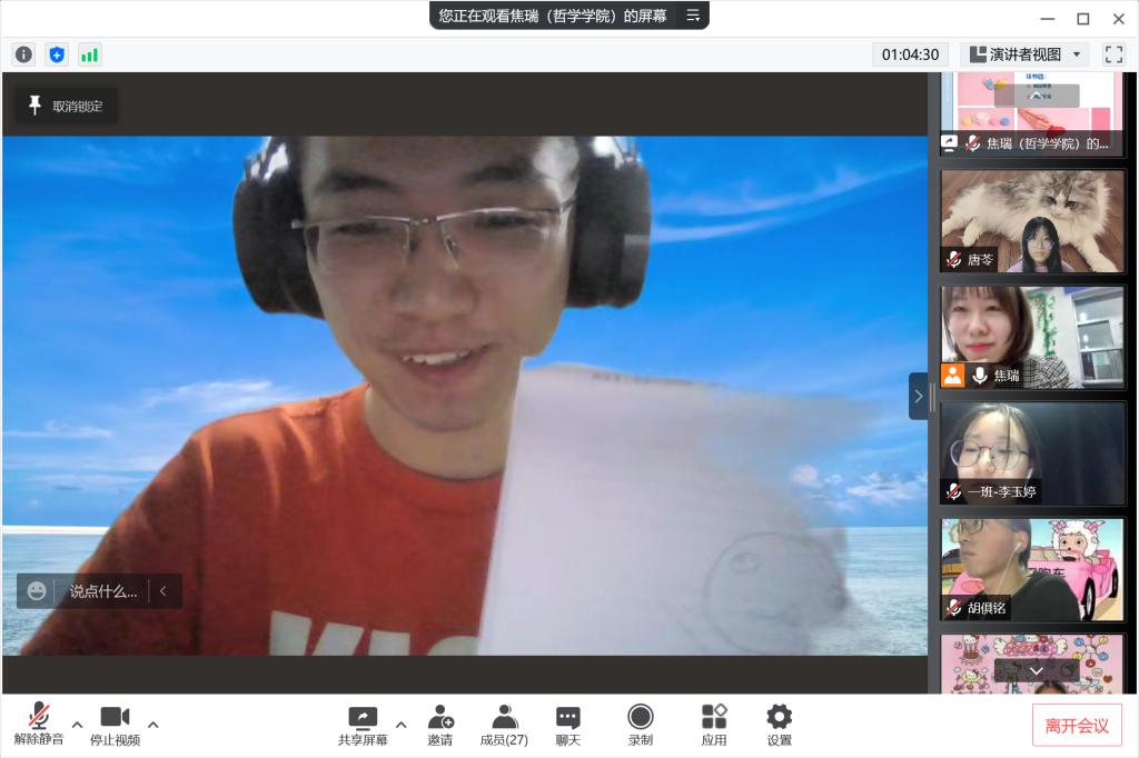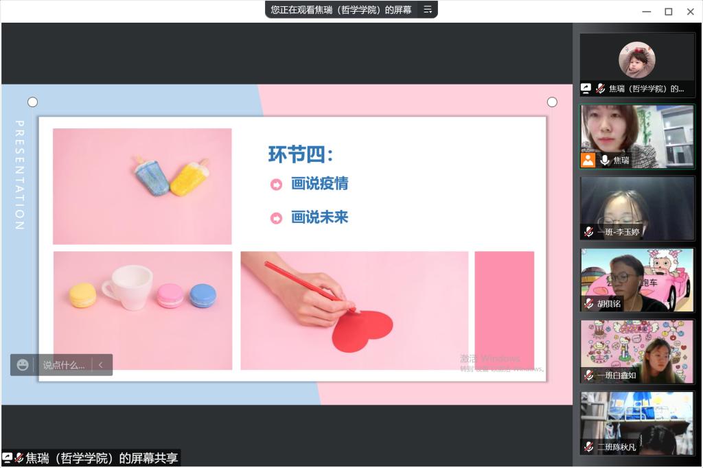 彼此支持,相互勉励。团体辅导接近尾声,焦老师希望大家享受当下,既然无法改变环境,那就换个心态,享受当下宁静的时光,潜心静气做研究,培养自己的兴趣爱好探索发现校园和同学的美好,同时,感谢大家互相真诚陪伴的一小时,在困难面前,彼此支持,互相陪伴,交流倾听,是很重要的。同学们也积极发言互相勉励。