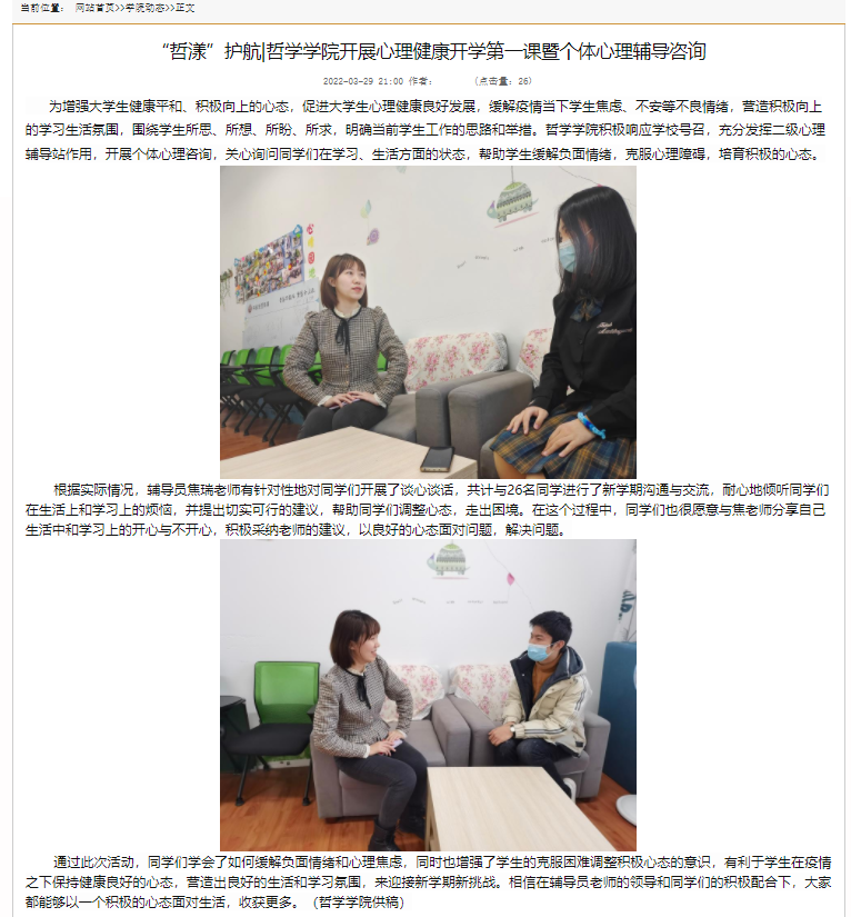 贴心谈心谈话,聆听学生心声。为全面了解学生心理状况,在疫情期间及时给予学生心理支持与疏导,学院组织全体学生认真填写思想、心理情况调研问卷,依托学校“四级心理健康教育工作网络”,通过个别咨询、团体咨询、网络咨询等多种方式,以谈心谈话、深入宿舍、课堂等渠道,为大学生提供及时、有效、高质量的心理健康指导与服务。学院在3月份开展了个体心理咨询,共计30余人次。个体心理咨询帮助了同学们增强了学生的克服困难调整积极心态的意识,有利于学生在疫情之下保持健康良好的心态,营造出良好的生活和学习氛围,来迎接新学期新挑战。