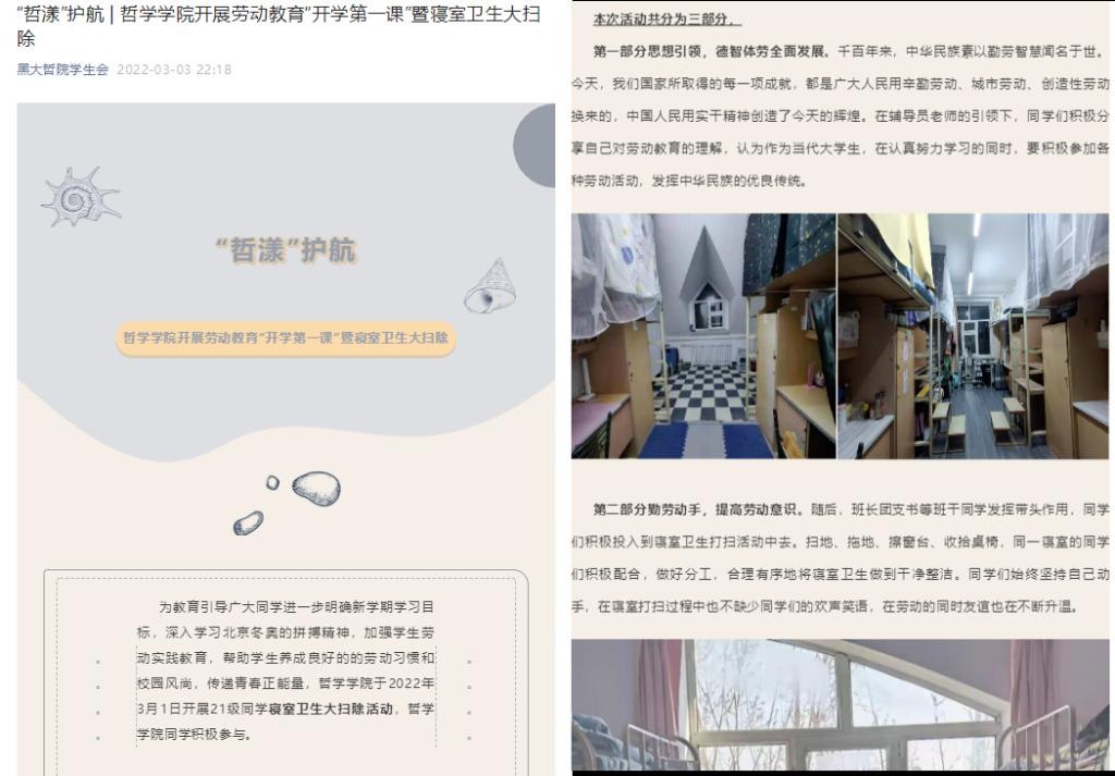 学生志愿者们通过参与疫情防控志愿活动,并发表志愿感想。同时,按照疫情防控要求,在保证安全的情况下,为加强学生劳动实践教育,帮助学生养成良好的的劳动习惯和校园风尚,学院开展21级同学寝室卫生大扫除活动,学院同学们积极参与。