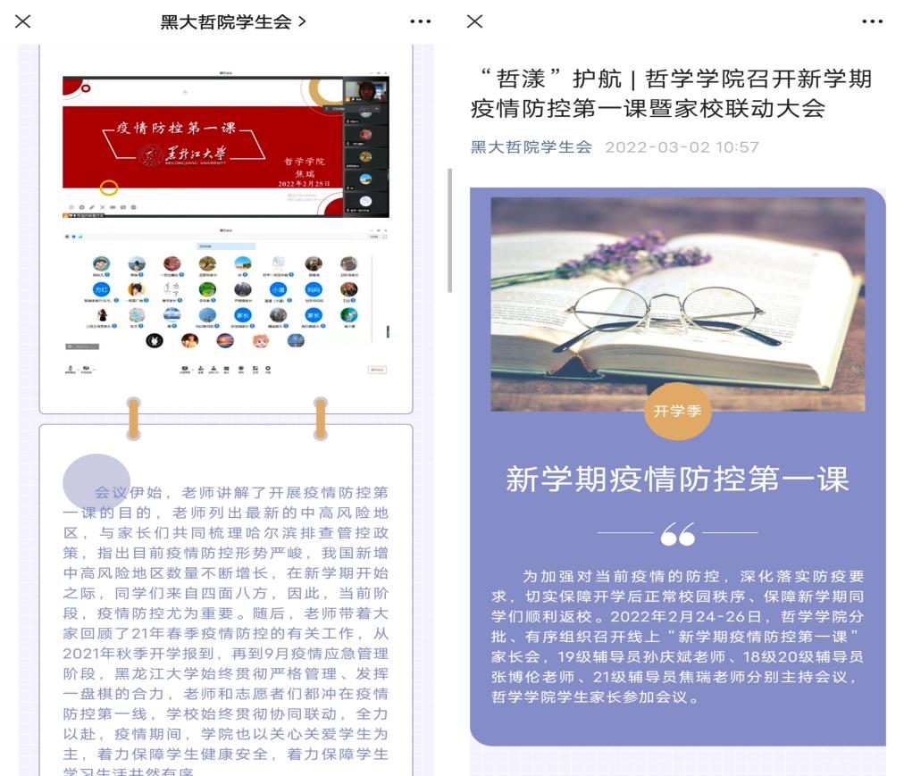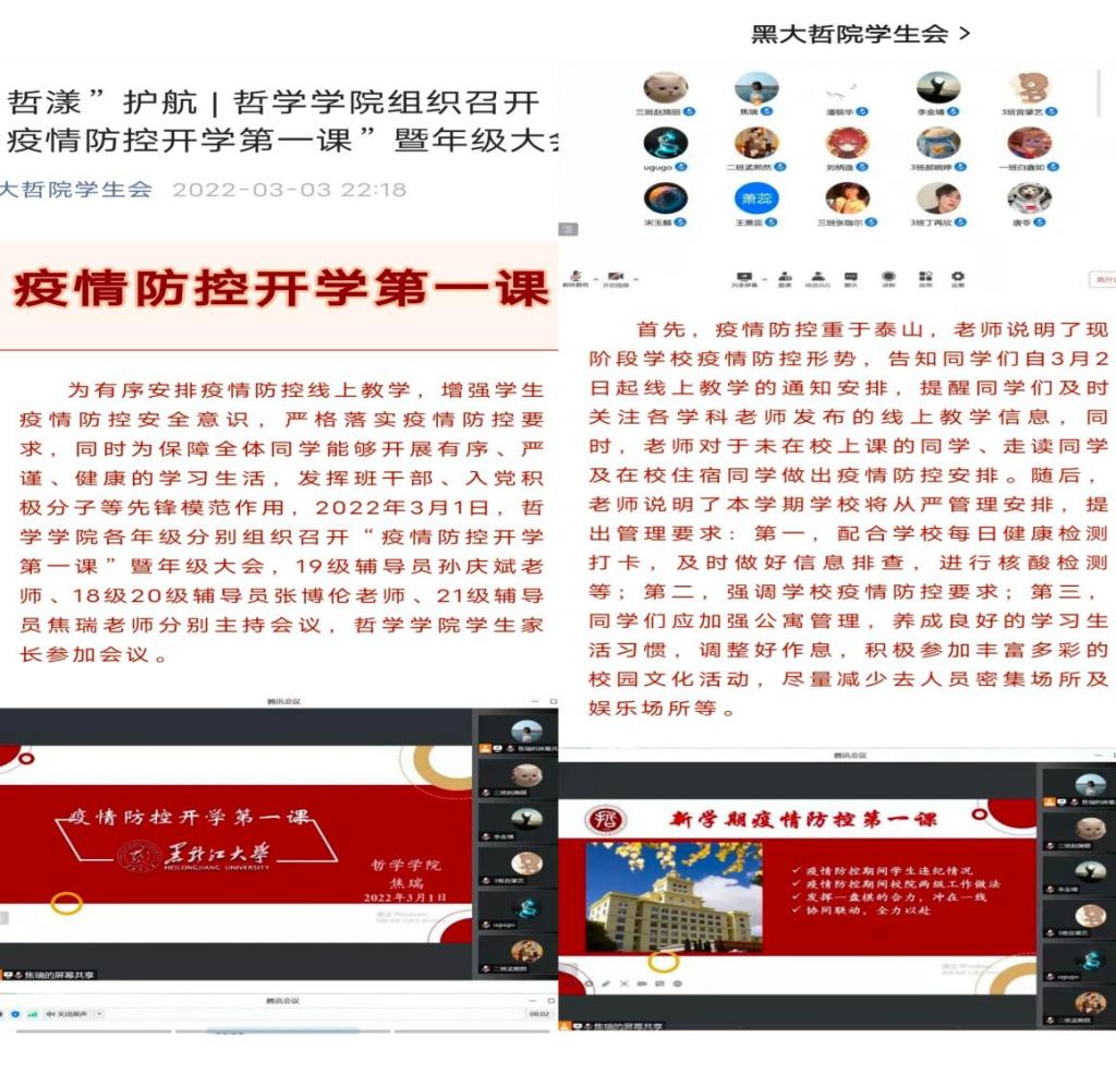 全体辅导员依托“今日校园”家校平台、家长群、腾讯会议等多种形式,于2022年2月24-26日召开新学期家长会。会上传达了学习疫情防控管理的相关规定,为保障学生安全有序返校,采取分层次、分批次返校的方法,建立形成轨迹与疫苗接种台账,实时关注学生行程轨迹与哈尔滨疫情防控管控措施。学校始终贯彻协同联动,全力以赴,疫情期间,学院也以关心关爱学生为主,着力保障学生健康安全。同时,学校为保障全体同学能快速进入状态,有序、正常、安心开启学习生活,将实行从严管理,加大纪律监管力度,严格纪律要求,明晰责任划分,明确管理要求。