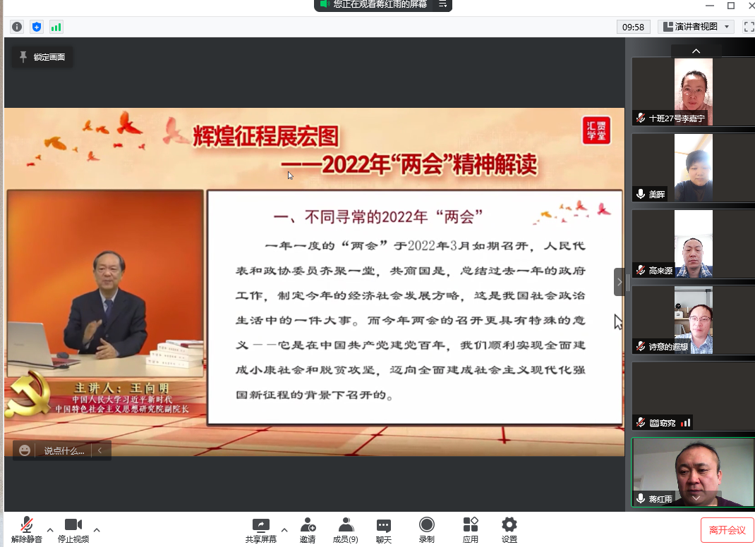 理论学习中心组成员共同观看学习了2022年两会精神解读讲座视频《辉煌征程展宏图》。此次专题讲座由中国人民大学习近平新时代中国特色社会主义思想研究院副院长、央视国际特聘专家王向明教授以《辉煌征程展宏图——2022年两会精神解读》为题,围绕全国两会召开的背景、未来工作的主要目标、高举旗帜向未来三个方面为大家做了全面、详实、清晰的深度解读。理论学习中心组学习后,教工第一党支部和教工第二党支部共同召开了主题党日活动,组织党员集中观看学习讲座视频《辉煌征程展宏图》。