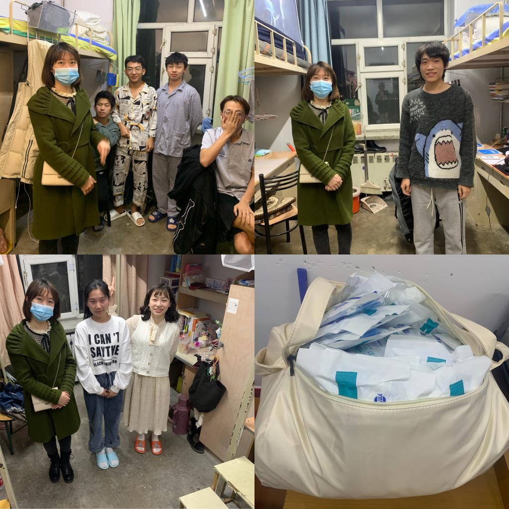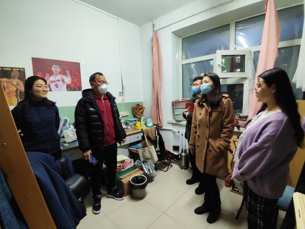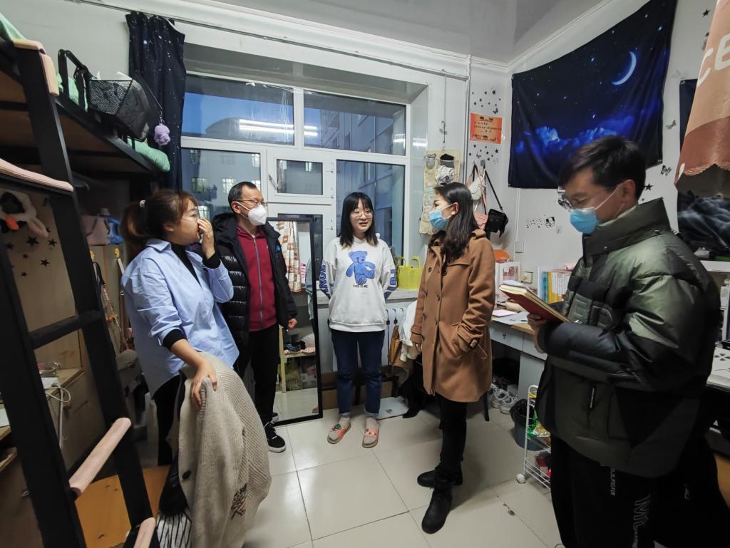 党总支副书记张丽丹、2019级辅导员孙庆斌、2018级、2020级辅导员张博伦和2021级辅导员焦瑞走进各年级学生寝室,为同学们送去疫情管理期间的关心与问候。