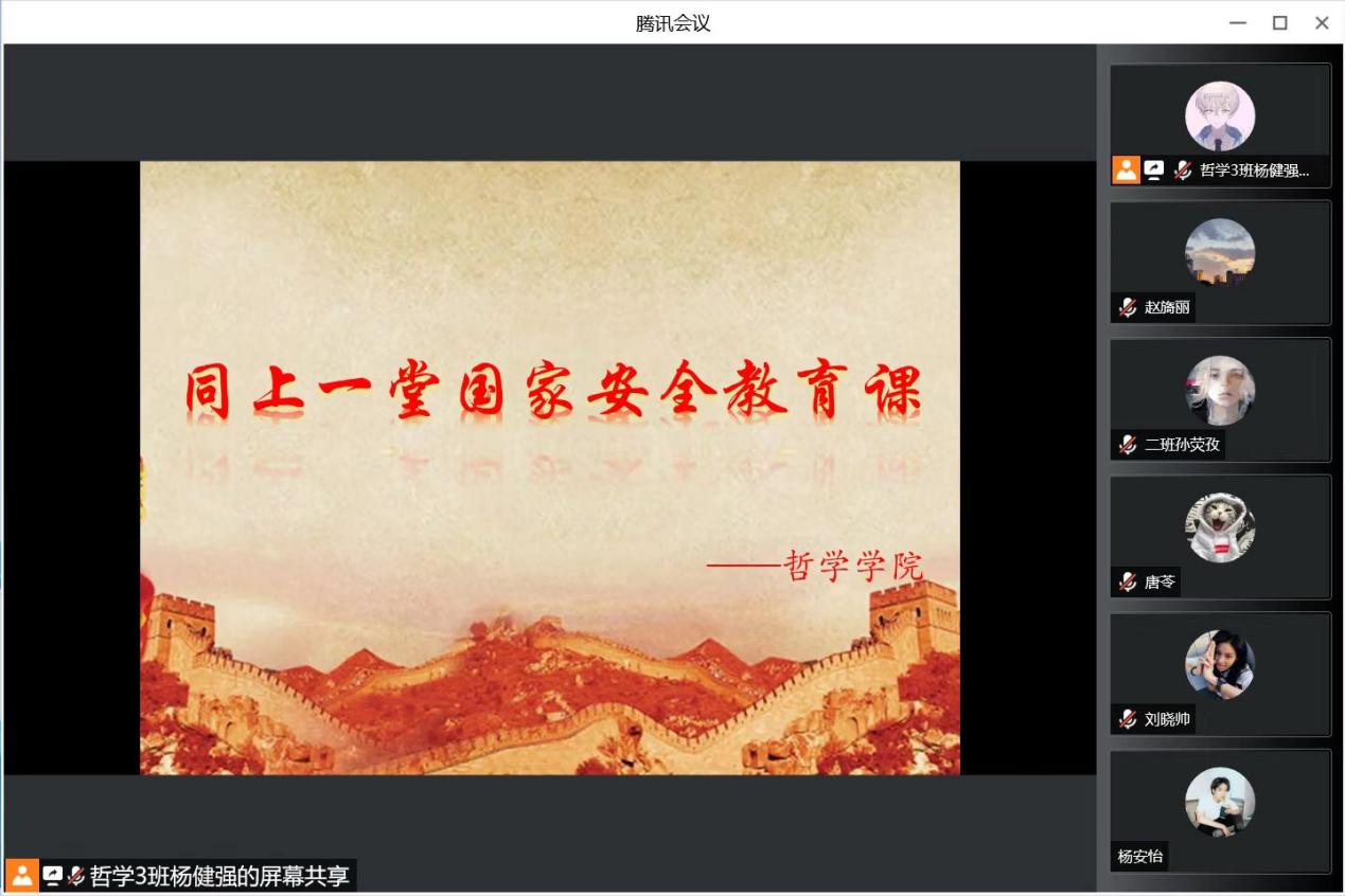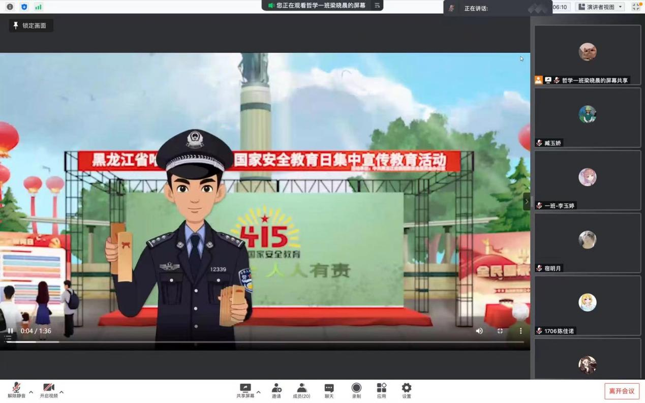 国家安全人人有责,随着信息时代的来临,机遇与危险共存,大学生安全教育刻不容缓,帮助大学生提高安全意识、树立正确的价值观安全观,极为重要。为推动国家安全宣传教育工作深入开展,增强学生国家安全意识,学院同学以班级为单位线上学习观看全民国家安全教育日的相关学习视频《我对您说,总体国家安全观》《我和新时代国家安全》。通过观看共同学习了解了总体国家安全观。