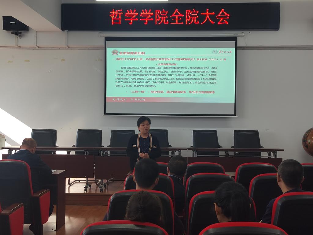 会上,孙美晖书记介绍了黑龙江大学《关于进一步加强毕业生就业工作的实施意见》的主要内容,重点解读了学院落实就业工作全员包保责任制实施推进情况,再次强调了落实全员包保责任制的重要意义、主要内容以及工作要求,动员学院全体教师切实促进毕业生更高质量就业。
