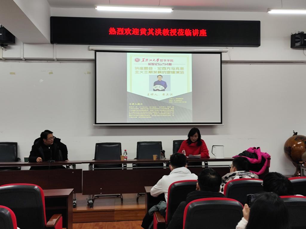 李昕桐教授首先对黄其洪教授的到来表示热烈欢迎和衷心感谢,并对黄其洪教授的研究方向和学术经历及其学术成果作了简要介绍。她指出,黄其洪教授长期从事马克思与德国古典哲学、马克思与西方实践哲学传统、当代激进左翼、移民现象学等领域研究,学术成果颇丰,在国内享有一定的学术声誉。随后,黄其洪教授从西方马克思主义的发展分期出发,对西方马克思主义的历史逻辑进行了具体的阐发。黄其洪教授通过对经典文本的分析,清理西方马克思主义三期发展的历史脉络,分析每一期发展的基本特征、历史背景和思想背景,剖析由第一期发展到第二期的原因,再分析由第二期向第三期发展的原因。在此基础上,重点介绍了第三期发展的现状和趋势,同时也讨论了国内西方马克思主义研究与第三期的关系,为学生全面勾勒出西方马克思主义发展的整体图景。