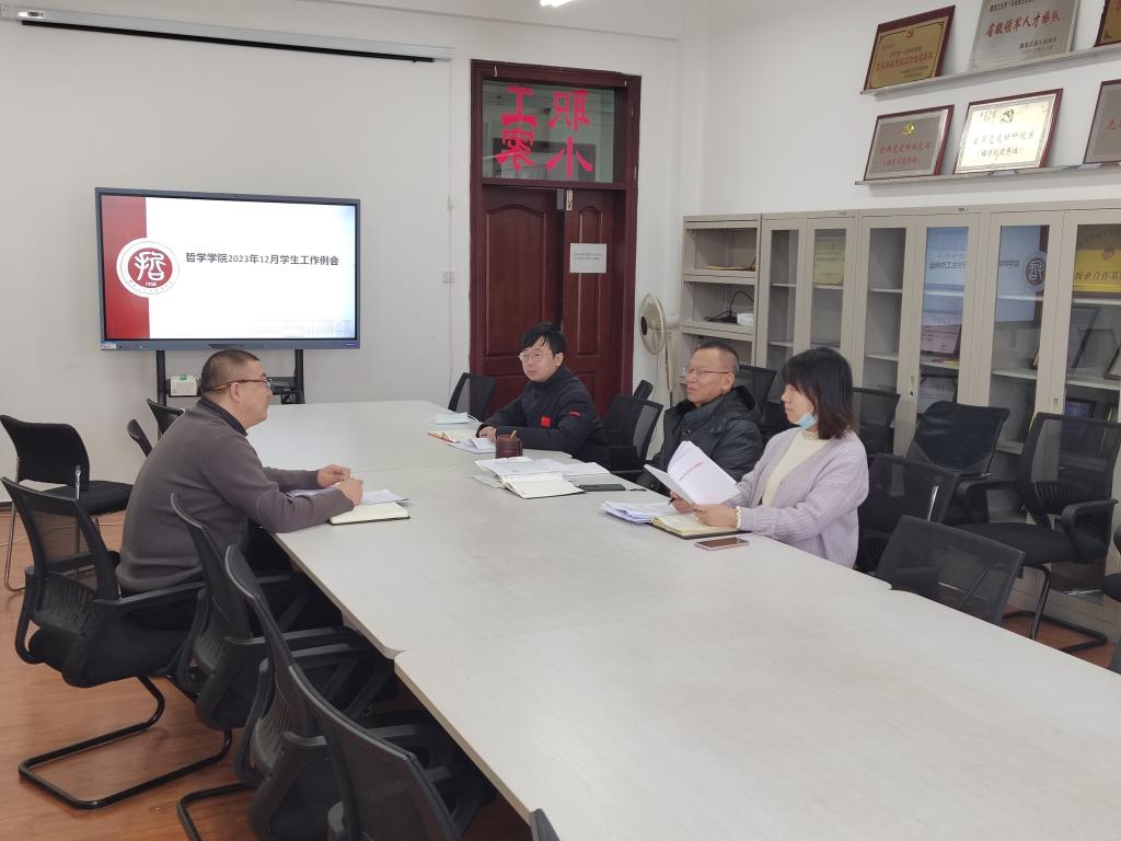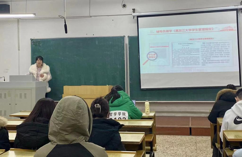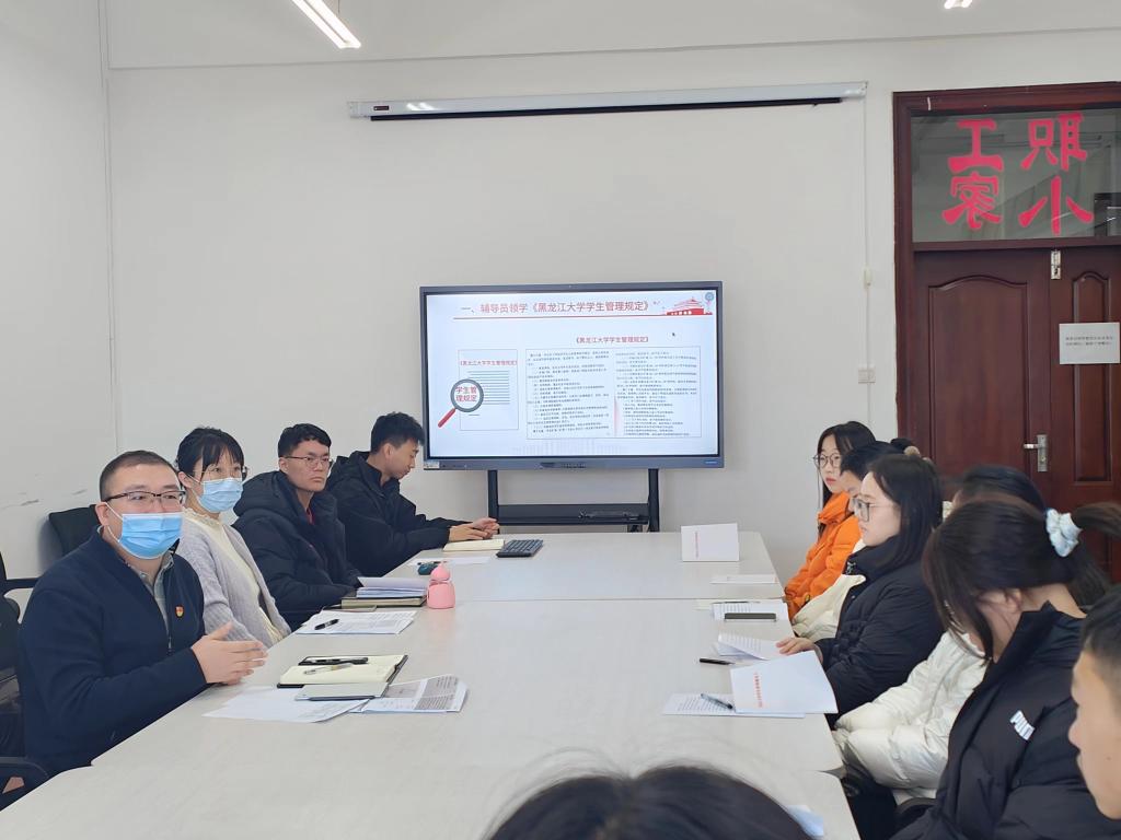 学生工作队伍高度重视学生日常管理教育工作,学院党总支副书记王贵宇主持召开学院12月份学生工作例会,带头领学新版《黑龙江大学学生管理规定》,专题研究部署推进“遵纪守法 文明修身”主题教育月相关工作,强调各年级辅导员要提高站位,细致掌握并吃透政策文件精神,结合各年级学生实际,结合典型案例深入学习交流,促进学生规范自身行为,切实促进教育管理提质增效。