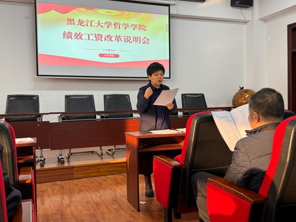 孙美晖书记详细介绍了绩效工资改革的具体内容,逐个解读四个文件《黑龙江大学绩效工资实施办法(试行)》、《黑龙江大学教学工作岗位绩效工资分配及教学工作量指导意见(试行)》、《黑龙江大学科研工作绩效工资分配及科研评价体系指导意见(试行)》、《黑龙江大学教学科研单位增值性评价指标指导意见(试行)》。在教学方面,采取“宏观切块、微观调整”的原则,设置教师年度教学工作量教学线,强化教授为本科生上课;在科研方面,包括基础科研工作量和科研激励工作量两个部分,鼓励教师积极参与学科研究、学术交流活动,提升学院的学术影响力。同时,对于积极参与社会服务,将哲学知识运用到社会实践中的教师行为也给予肯定和奖励。通过文件的解读学习让教职工们对绩效工资改革有了更清晰的认识,明确了努力的方向。