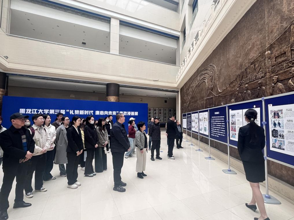 党委组织师生党员于5月7日在博物馆一楼展厅参观黑龙江大学第三届“礼赞新时代 廉心向未来”廉政漫画展。