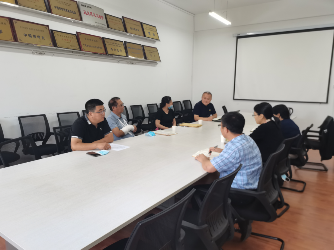 副院长周来顺教授,中国哲学学科带头人柴文华教授、后备带头人魏义霞教授、中国哲学硕士生导师组组长王秋教授、学术骨干周晓莹副教授、中国哲学教研室主任于跃老师。蒋红雨院长主持本次调研活动。