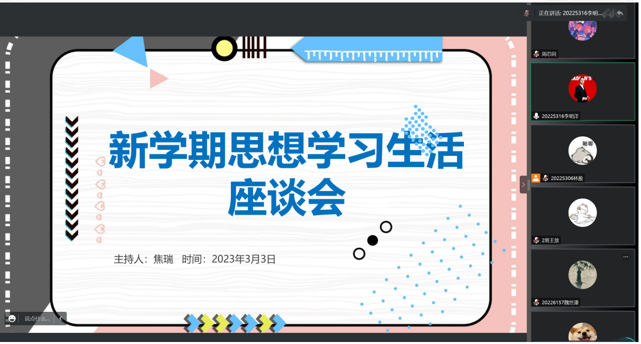 开展座谈广抒怀,畅谈心声树新风。2019级辅导员孙庆斌老师自2月25日开学以来,按照学校工作要求,根据本年级毕业年级的特有属性和学生特点,通过线下线上开展座谈会、寝室走访等形式,与年级所有的80名同学进行了一对一谈话,摸清了学生思想、思考、心理,并对一些问题进行了有针对性的交流、沟通、疏解,并对共性普遍的问题向主管领导和上级部门进行了反馈。2020级辅导员张博伦老师于3月1日-9日分别召开了新学期年级大会、学生党员干部座谈会等,全面了解了假期学习生活和思想情况,围绕学生关心的重点焦点问题,进行了沟通交流和教育引导,帮助学生解决困惑,明确了下一阶段工作思路与举措,有针对性地做好学生日常事务管理和服务工作。2021、2022级辅导员焦瑞老师面对学生代表、家庭经济困难学生分批次召开了4场新学期思想学习生活座谈会。会议围绕“疫情对同学们生活的影响”、“国内外时事热点问题”、“对学校学院的工作建议问题”、“对新学期的展望“等几个话题进行。在会议中,同学们对学校的基础设施建设、学习、生活方面表达了自己的一些建议和希冀,焦老师也与同学们进行了沟通和交流,同时也希望同学们能多多理解学校体量大人数多,基础设施的更新运行调整需要时间。