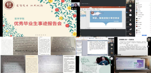 毕业季系列活动:优秀毕业生事迹报告会、推免·考研经验分享交流会、就业指导会等等,并且面对在校的本科生开展了“承前致思,书香陪伴”主题读书活动和“春意四月书香浓——学业导师‘四个一’”读书活动,使古老的智慧与哲学学子邂逅,迸发出激情的火花。在激烈的思想交锋中,爱智之子们轻抚思悟纹理,洞察知识力量,漫步文明路途,寻求真理光芒。