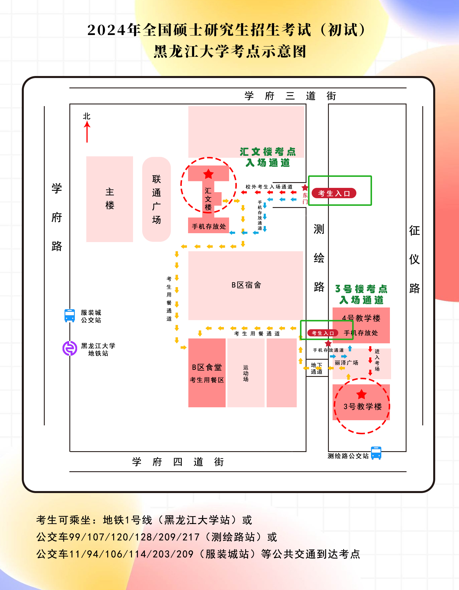 六、其他安排。因上、下午两科考试的间隔时间较短、考生较多,建议考生中午不存取手机。黑龙江大学考点为校外考生开放子衿园(B区)食堂,盒饭标准为20元每份,有就餐需求的考生请在早上存放手机环节购买餐票(建议自备零钱)。本校考生请至学校其他食堂就餐。
