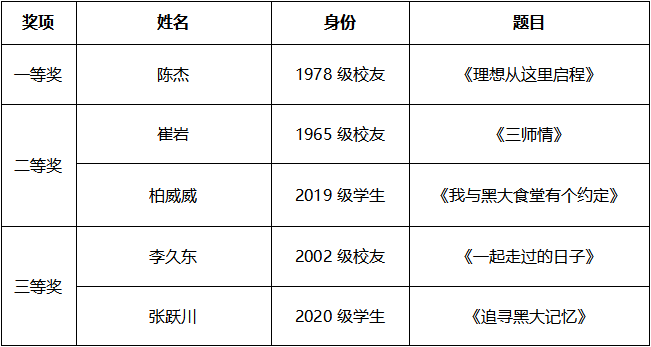 在喜迎黑龙江大学建校80周年之际,校庆主题征文活动得到了广大校友、在校师生及社会各界人士积极响应、踊跃参与。经专家评审,共有5人获奖,其中选出一等奖作品1篇、二等奖作品2篇、三等奖作品2篇,现将评选结果予以公布:
