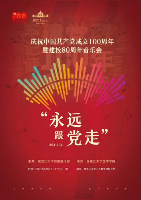 为喜迎中国共产党成立100周年和黑龙江大学建校80周年,黑龙江大学将于2021年6月22日15:30在三号教学楼报告厅举行“永远跟党走”黑龙江大学庆祝中国共产党成立100周年暨建校80周年音乐会,本次活动由黑龙江大学党委宣传部主办、黑龙江大学艺术学院承办。