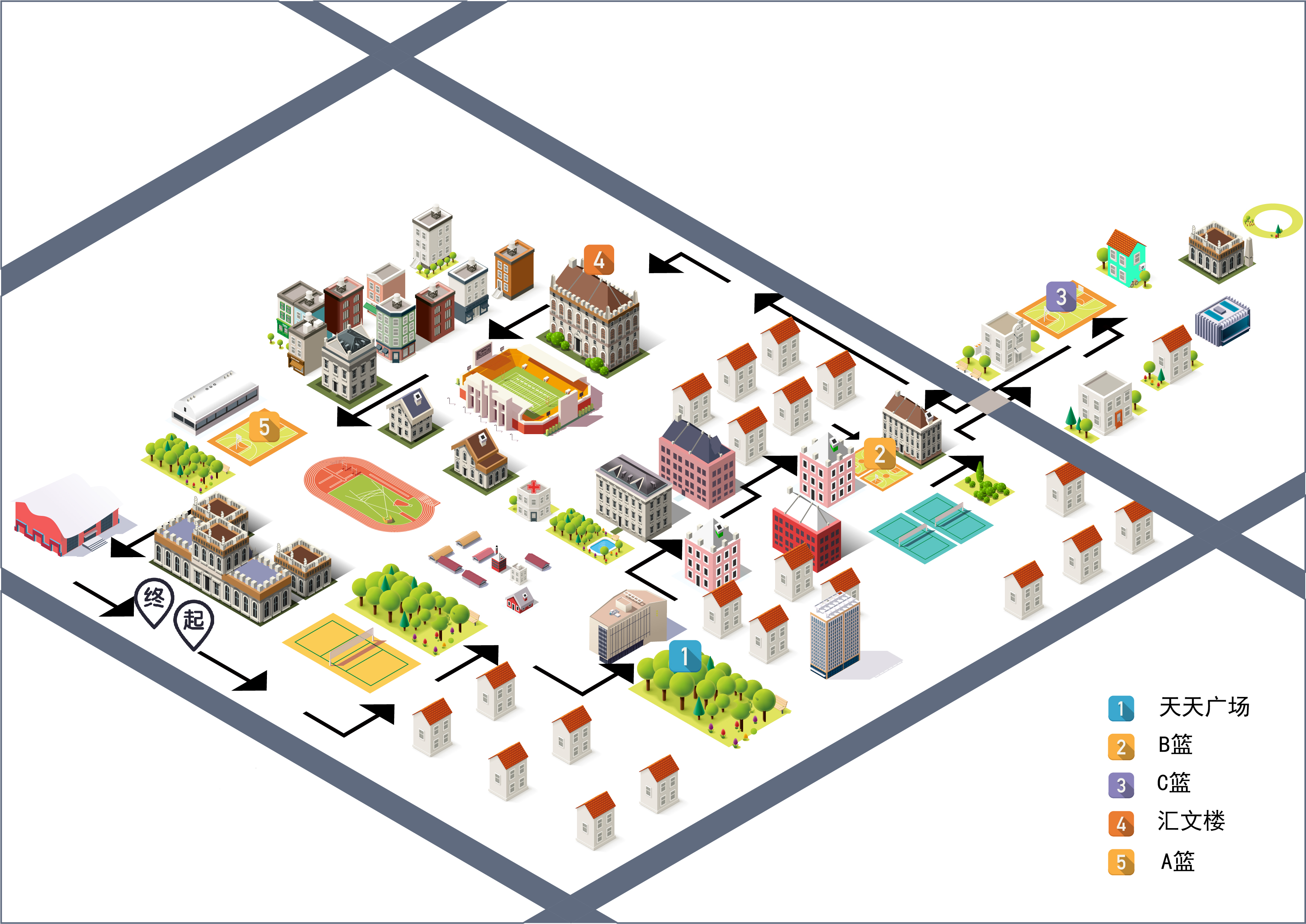 主楼广场为活动起点和终点,沿途共设置5个徒步任务点,分别为天天广场、A篮球场、B篮球场、C区篮球场、汇文楼前广场。