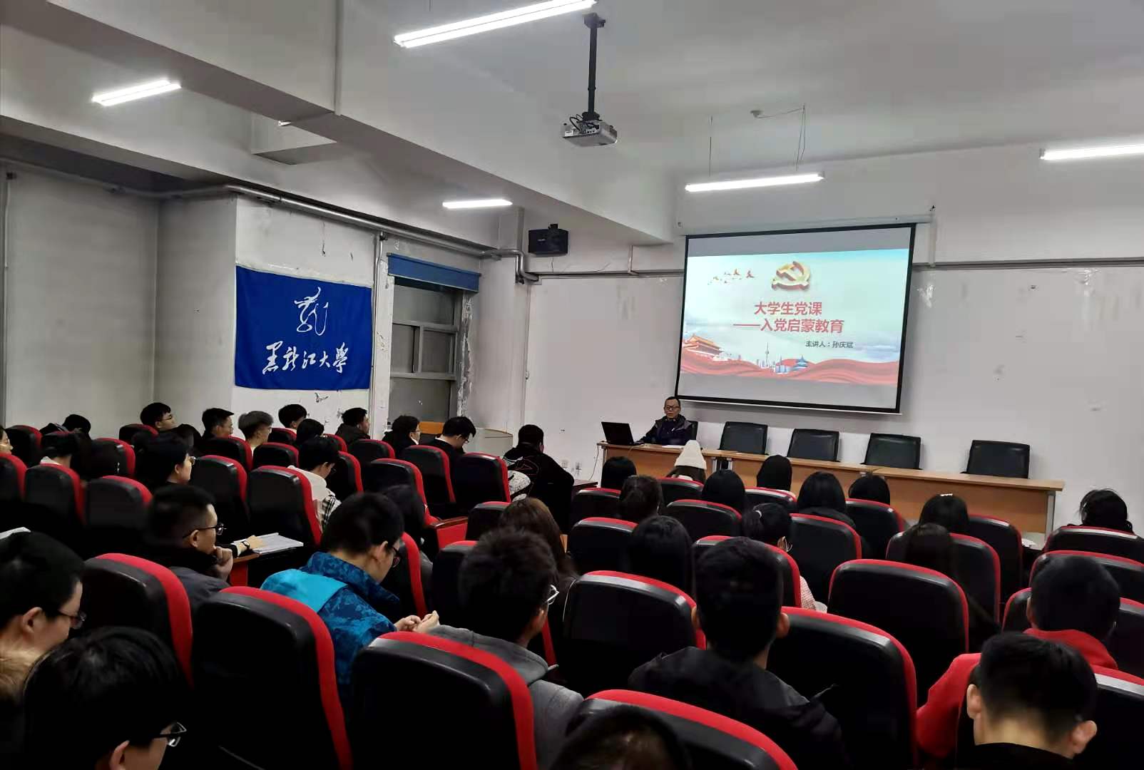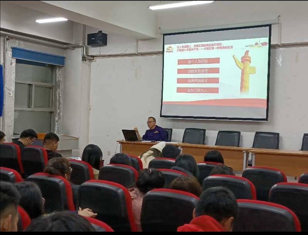 党课伊始,孙庆斌老师对党的基本理论知识进行介绍和重点讲解,帮助学生明确理解中国共产党是中国特色社会主义事业领导核心,也只有中国共产党才能领导中国革命、建设、改革、发展事业走向成功。接下来,就大学生为什么要加入中国共产党?孙老师对全体学生进行党和青年的关系专题讲解。孙老师指出,作为新时代的大学生应该紧跟时代的步伐,以时代的新标准来严格要求自己,让自己不断提升,以适应新时代的特征,有新时代的气象。中国共产党是与时俱进的党,党和祖国的建设事业的发展需要青年,青年的成长更离不开党组织的关怀和培养。青年学生一定要端正入党动机,不仅要在组织上入党,更要从思想上入党,这是一个根本性的原则问题。青年学生要保持思想的先进性和纯洁性,向优秀党员学习,向党中央看齐,要自觉接受党组织的考察、培养和教育,不断加强自身综合素质与能力,以实际行动接受组织和群众考验。
